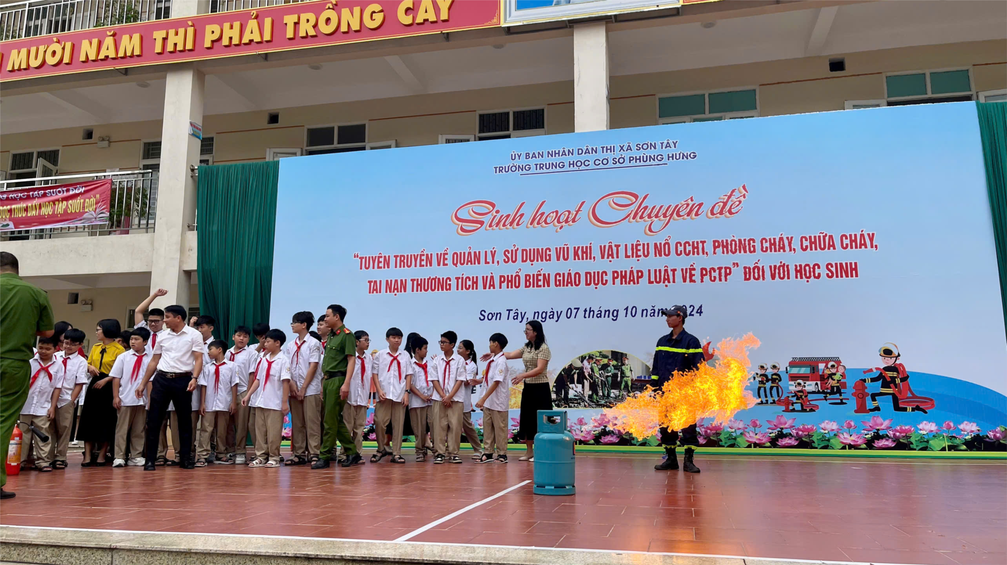Phần truyền đạt kiến thức, kĩ năng và kinh nghiệm của các đồng chí cảnh sát Phòng cháy chữa cháy và cứu nạn cứu hộ với các bạn học sinh trong nhà trường. Những câu hỏi của đồng chí công an và sự tham gia nhiệt tình sôi nổi của các bạn học sinh.