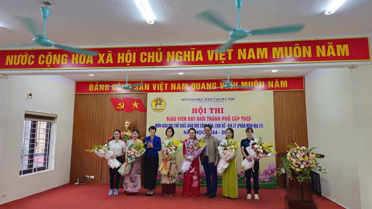 Ban giám khảo cuộc thi cùng thầy giáo Khuất Quang Hải - Bí thư chi bộ, hiệu trưởng nhà trường tặng hoa chúc mừng cô giáo Thu Hà.